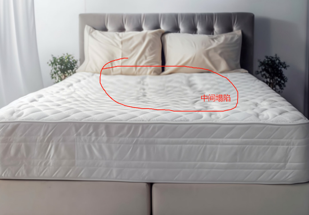 一些床垫弹簧线径太细,尤其是中部区域很多商家采用1.4mm-1.8mm线径,使用过程中容易塌陷,如下图:
