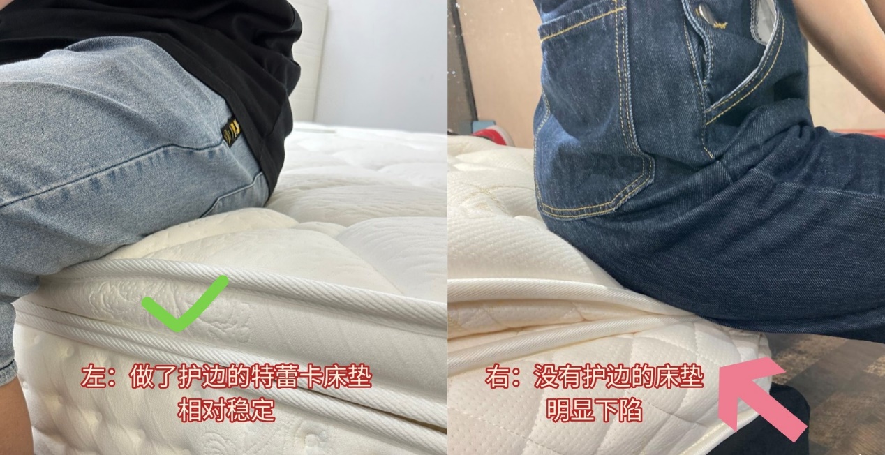 采用钢丝 + 立簧 + 5cm硬质泡棉三重护边结构,支撑稳、坐感踏实,不像有些床垫一坐就塌。我们测过一些海外品牌,发现不少根本没有护边设计,睡感可能洋气,但不太适应国内习惯,尤其是带娃起夜、久坐床边这种场景,体验感明显打折。