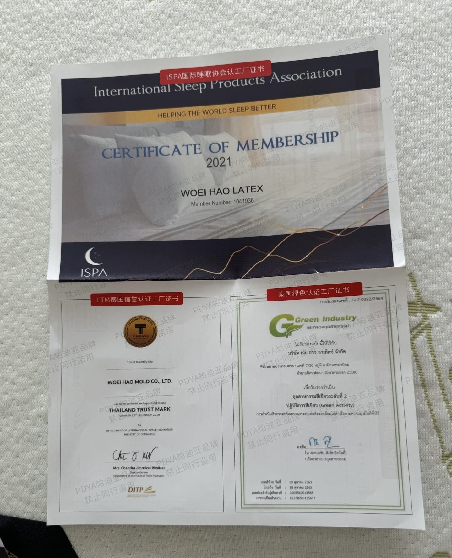 帕迪亚乳胶含量高达93%,并通过各项认证,包括:ECO 天然乳胶认证、GOLS 全球有机乳胶标准(极少厂家能通过)、LGA 德国耐用度与回弹测试等,每张床垫都附有认证报告。